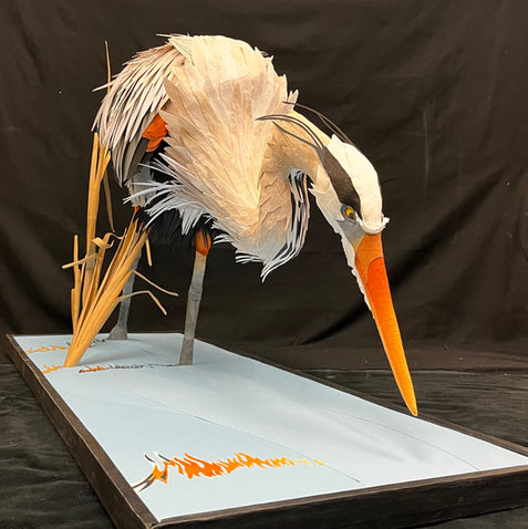 The creature that started out as a community college assignment that went off the rails. It is entirely made of paper products per the assignment guidelines. The body is a baffled cardboard armature. It is skinned with strips of drawing paper and then overlaid with Canson paper, paper towels, and tracing paper (long feathers on the back). Paper towels are used from the base of the neck to the head and on the legs and beak. The paper is dyed with a watercolor mixture. The cattails are cardboard cut and sanded to shape. The base has seven layers, alternating from chipboard to cardboard to build up the “floor” of the base, then covered with blue Canson paper. The reflection on the water is paper towels, delaminated and painstakingly cut into the desired shape. The overall weight of this piece is only about twenty pounds. It took 325 to 350 hours to complete. The important takeaway I found from this piece was that paper towels could be used as a versatile problem solver.